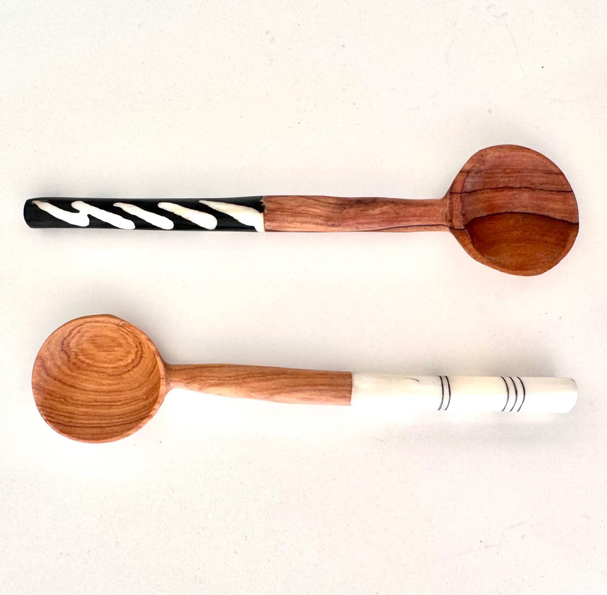 One (1) coffee/tea scoop spoon handcrafted from wild olive wood and etched cow bone made my talented artisans in Uganda. The spoons are great for daily use with that morning cup of coffee or tea or make a wonderful gift for the coffee/tea lover in your life!