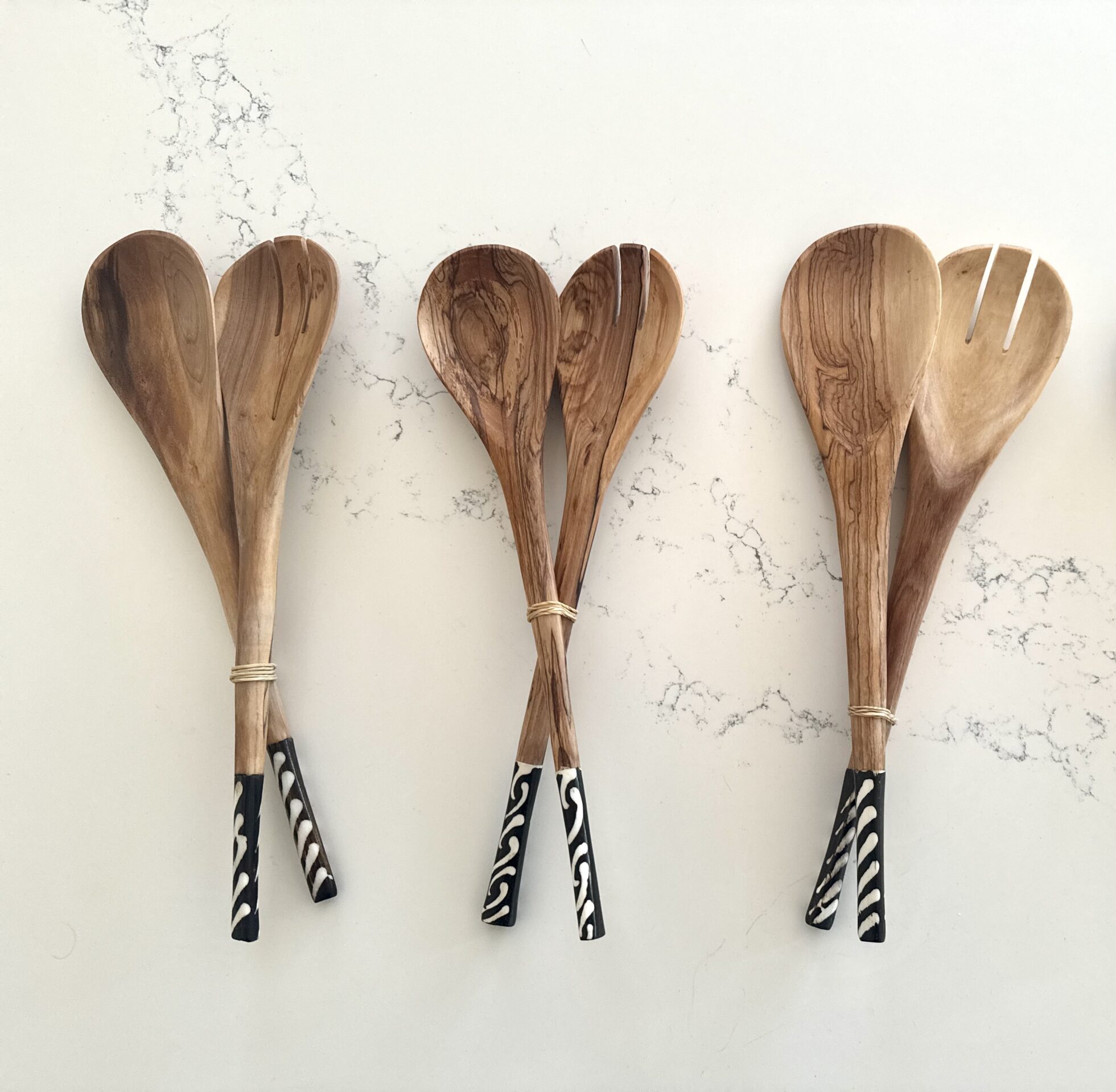 Natural elements are combined to create this beautiful set of salad servers made by talented artisans in Uganda. The lovely grain of wild olive wood beautifully compliments the cow bone – each with a unique, etched design. The server handles are made from polished cow bone that has been etched with a beautiful design. These servers will surely add beauty to any dish.